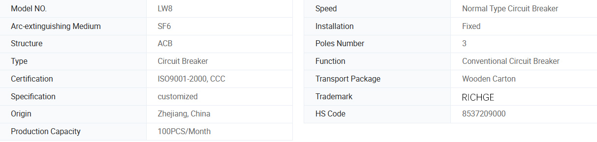 LW8-40.5, LW8A-40,5 серии серии серии серии LW8A-40,5 серии серии серы серии серии серых серии серы-это трехфакторное электрическое оборудование с высоким напряжением, подходящее для контроля и защиты системы трансмиссии 40,5 кВ. Продукт можно использовать с механизмом пружины CT14. Выключатель схемы соответствует национальному стандартному стандартному GB1984-1989 году выключателя высокого напряжения AC AC и стандартной электротехнической комиссии IEC56, IEC6220-100 высоковольтных цепи переменного тока.