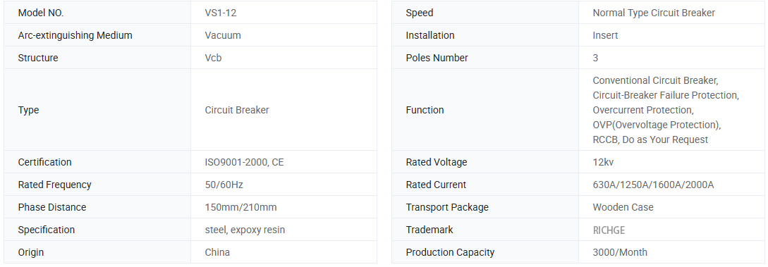 VS1 (ZN63A) -12SERIES крытого вакуумного выключателя с общим изолированным цилиндром представляет собой трех фразу A.C. 50 Гц оборудования для распределения электроэнергии с номинальным напряжением 12 кВ. Он используется для защиты контроля электрического оборудования в областях промышленности и горнодобывающих предприятий, электростанций и подстанции. Этот выключатель вакуумной цепи типа соответствует национальным стандартам и установлению стандарта МЭК, способность достигает степени M2-E2-C2.