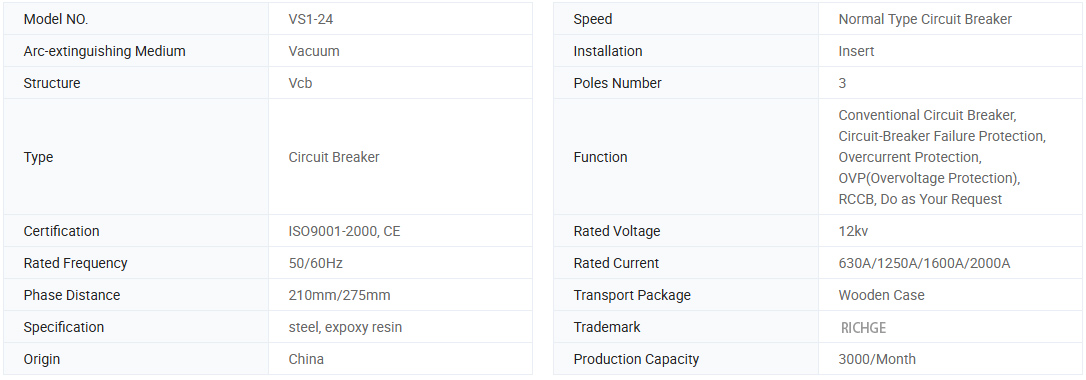 Серия VS1-24 выключателя вакуумной цепи высокого напряжения с общим изолированным цилиндром представляет собой трех фразу A.C. 50 Гц оборудования для распределения энергии в помещении с номинальным напряжением 24 кВ. Он используется для защиты контроля электрического оборудования в областях промышленности и горнодобывающих предприятий, электростанций и подстанции. Этот выключатель вакуумной цепи типа соответствует национальным стандартам и установлению стандарта МЭК, способность достигает степени M2-E2-C2.
