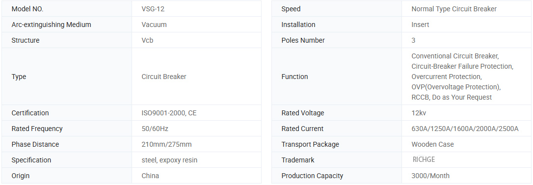 VSG-12 Тип Внутреннего Высокого напряжения выключатель вакуумной цепи используется пружина для энергии хранения. Рабочий механизм может работать с двумя способами, с помощью ручной и электроэнергии, характеристики соответствуют GB1984-2003 высокого напряжения, выключатель с цепи переменного тока JB3855-1996 3,6-4,5 кВ в внутреннем схеме переменного тока.