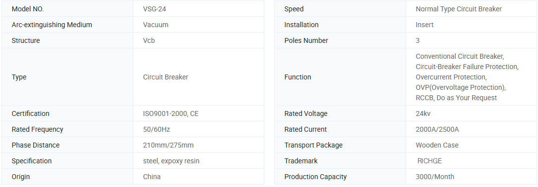 Серия VSG-24 выключателя вакуумной цепи высокого напряжения с встроенными полюсами представляет собой трехфазное оборудование A.C 50 Гц в помещении в помещении с номинальным напряжением 24 кВ. Он используется для защиты и управления электрическим оборудованием в области отрасли и Ming Enterprise, электростанций и подстанции.